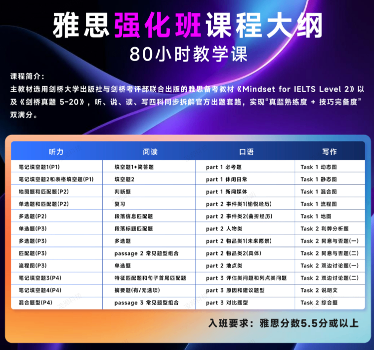 课程简介:雅思强化班通过高效技巧讲解与系统化知识点梳理,助您在短期内实现分数的飞跃。无论是听力部分的精准捕捉,阅读理解的深度剖析,还是口语表达的流利自如,写作技巧的巧妙运用小班授课确保每位学员都能获得个性化指导,听说读写四大板块全方位覆盖,针对性强化训练..