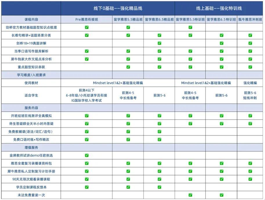犀牛开设雅思培训课程,包含雅思零基础衔接班、雅思5分/6分/6.5分/7分等冲刺课程,针对不同基础想要达到目标分数的学生,匹配对应的课程学习。