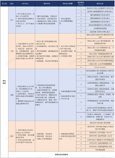 从零基础到冲刺7+,分阶段设班 衔接班→预备班→基础班→强化班→冲刺班,并配一对一和寒暑封闭班集训,线上线下同步开课。