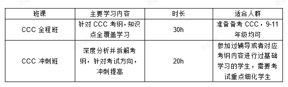 适合学生:9~12年级在校高中生,有一定英文基础;参与形式:个人参与,试卷笔试,无实验考试;试卷设置:全英试卷,包含25道选择题,需要在60分钟内完成,满分25分;课程内容:针对CCC考纲,知识点全覆盖学习,准备备考CCC。