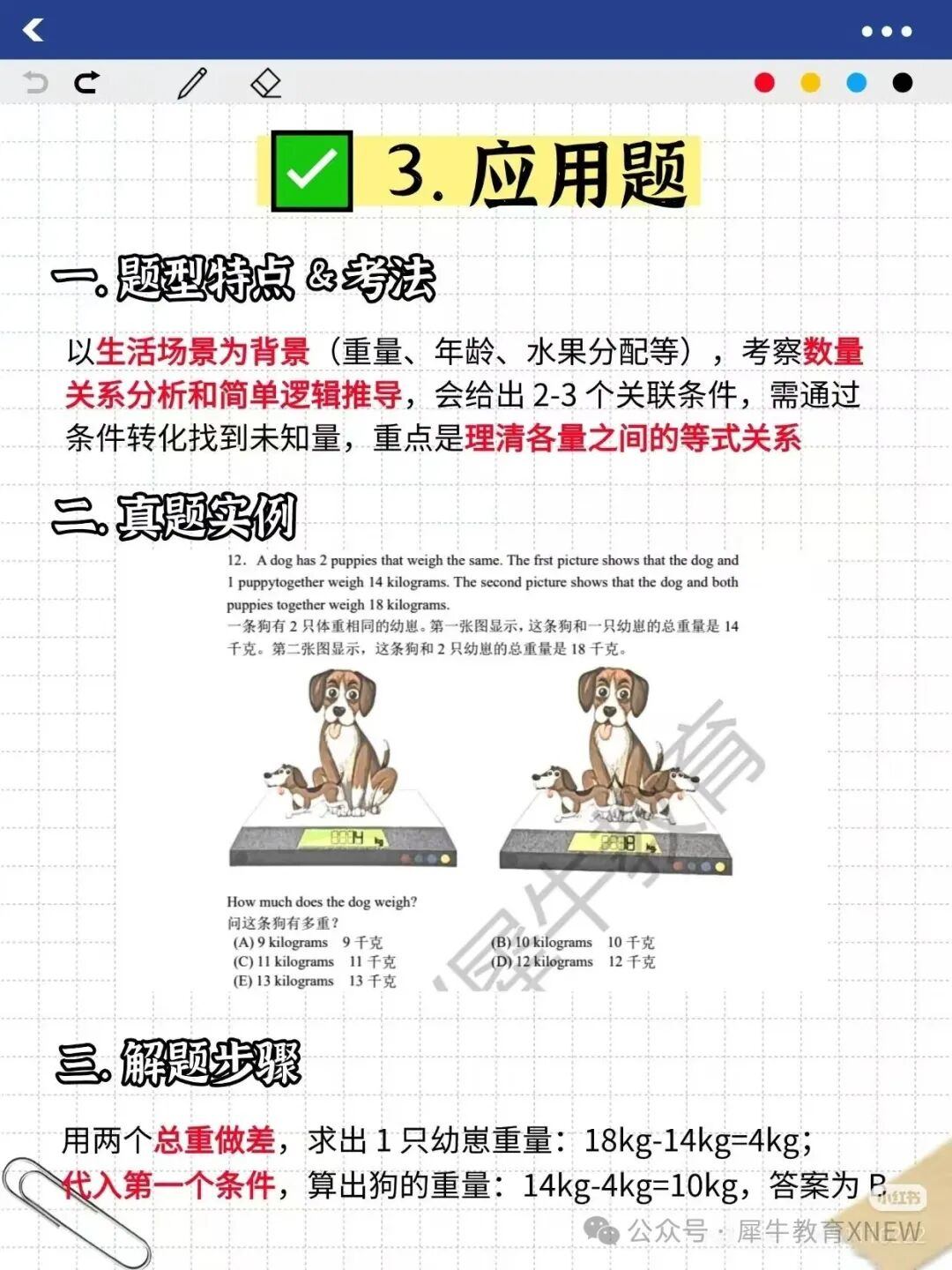 代入第一个条件,算出狗的重量:14kg - 4kg = 10kg,答案为 B