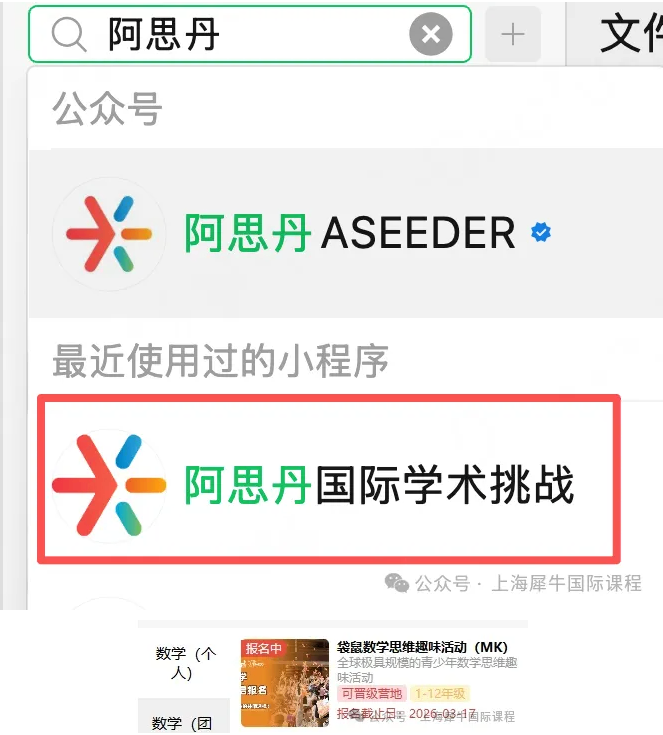 在小程序搜索栏输入 “袋鼠数学竞赛”,进入项目详情页。