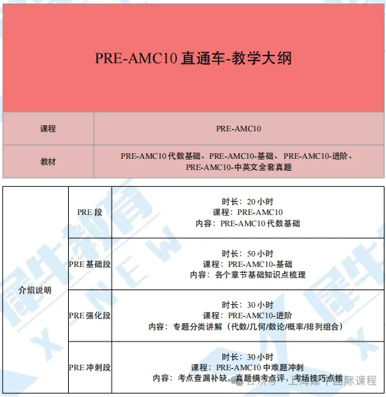课程内容:衔接20h+基础50h+强化30h+冲刺30h,搭建竞赛框架,从校内数学过渡到 AMC10