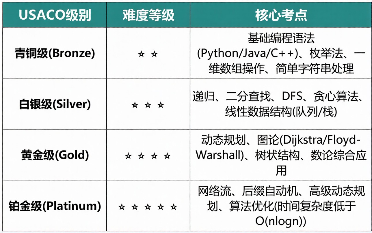 USACO(USA Computing Olympiad)是美国计算机奥林匹克竞赛,面向全球中学生开放(6年级及以上),全程线上参赛,无国籍、地域限制,是国际范围内含金量顶尖的计算机竞赛。