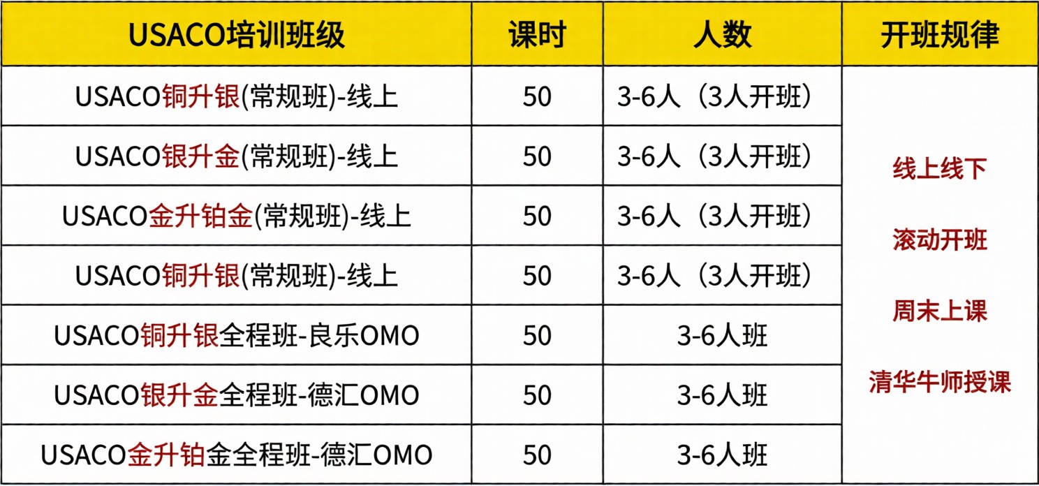 犀牛USACO计算机竞赛培训课程针对不同基础的学生,精心设计了从青铜到铂金的全程班、常规班、冲刺班等多种班型,以及铜升银、银升金、金升铂金等专项提升课程,课程语言有C++、Java、Python等专项辅导课程。
