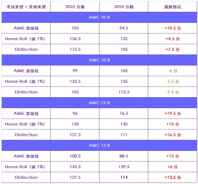 2025年晋级AIME的门槛全线飙升,AMC10A卷直接涨了快10分到105.B卷虽微降到99但依然高位运行;