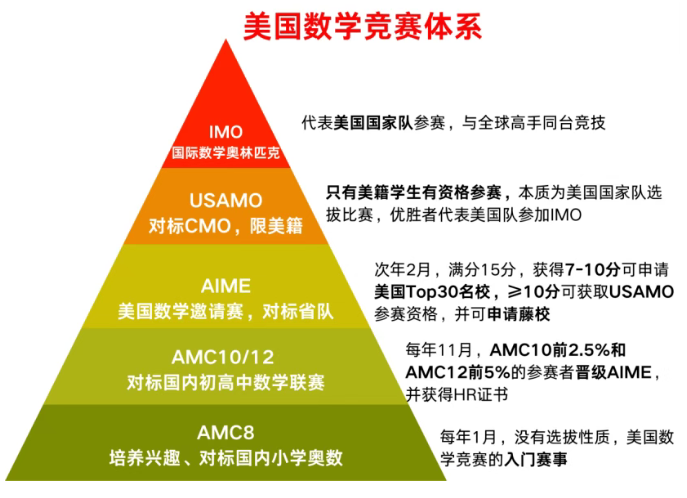 AMC目前全球最具影响力和信誉度的数学竞赛之一,由美国数学协会(MAA)主办,该竞赛旨在激发学生的数学兴趣,并为美国国际数学奥林匹克(IMO)选拔人才。AMC竞赛其体系完整,形成了一个清晰的进阶路径,主要分为以下几个级别: