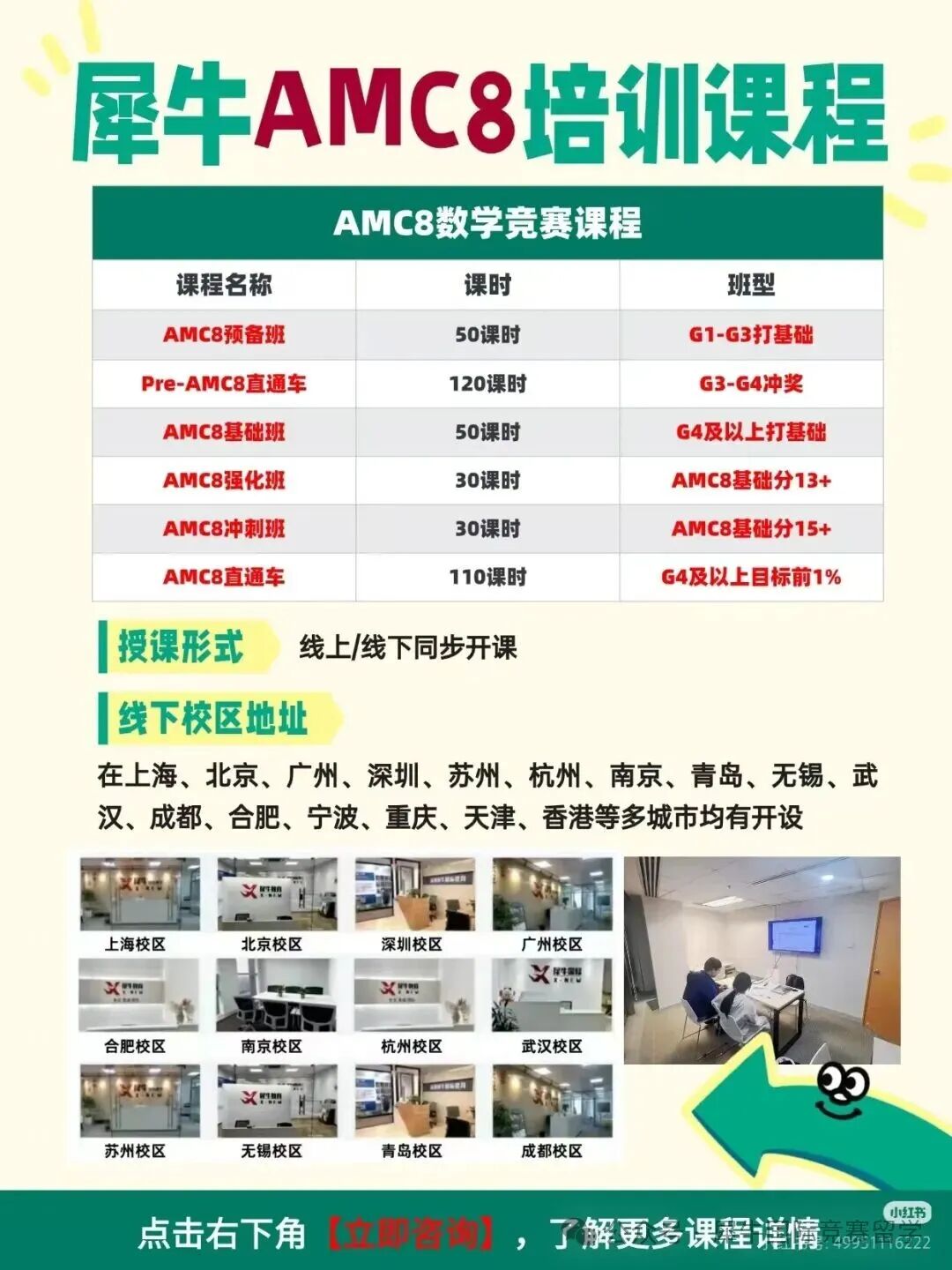 结合 AMC8 竞赛备考全周期需求,犀牛教育打造了从入门到冲奖的完整课程体系,搭配五维闭环教学服务,不管是低龄孩子打竞赛基础,还是高年级学生冲刺全球前 1%,都能找到适配的学习方案,帮孩子高效提分、稳稳拿奖!