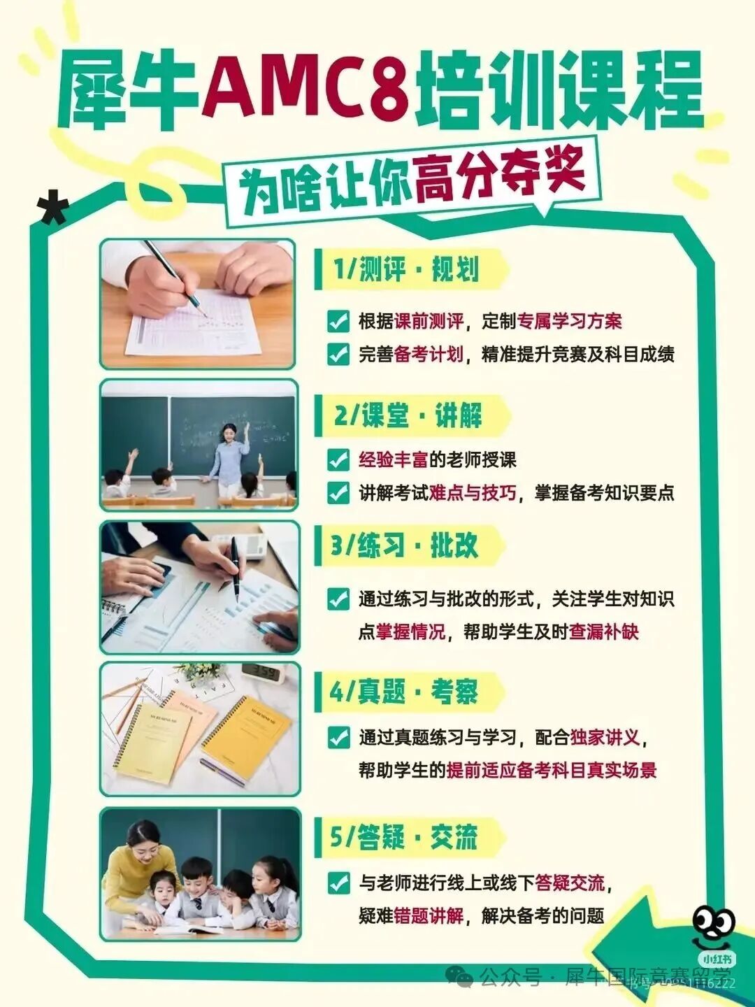 犀牛 AMC8 课程以 “测评 - 讲解 - 练习 - 考察 - 交流” 为核心,打造全流程教学服务闭环,从备考规划到考前冲刺,全程陪伴孩子,确保每一步都走得扎实有效: