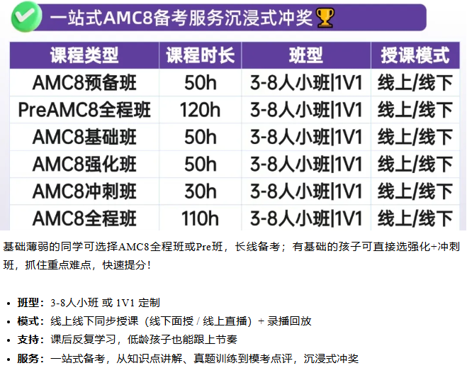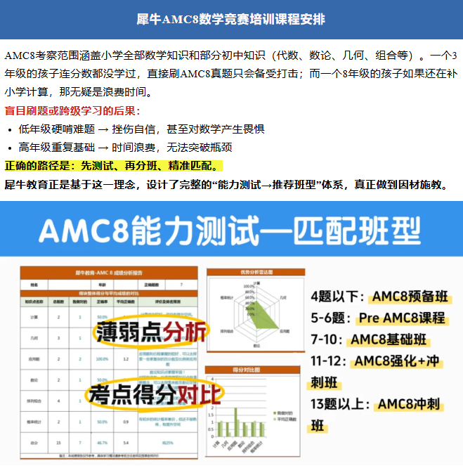 AMC8是美国数学思维活动,针对8年级及以下学生,题型全是选择题,共25题,40分钟,满分25分,考察内容贴合中小学数学核心,不考超纲偏题怪题,主打思维灵活度和解题技巧。