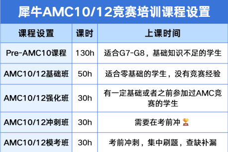 现阶段,对于校内知识基础已经掌握的比较扎实,正是备考AMC10的黄金时期!建议主攻代与几何的核心知识点,精练真题前15题的解题套路;同时开始接触数论与组合的基本题型。