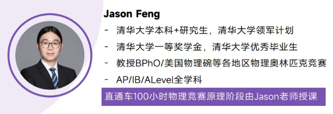 Jason Feng:清华本硕 + 领军计划,一等奖学金、优秀毕业生,主讲100 小时原理阶段,覆盖 BPhO / 物理碗 / AP/IB/ALevel 全学科