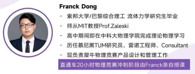 Franck Dong:索邦大学 / 巴黎综合理工流体力学硕士,MIT 教授门生,慕尼黑 TUM 研究员,负责20 小时冲刺阶段,亲授真题技巧与命题逻辑