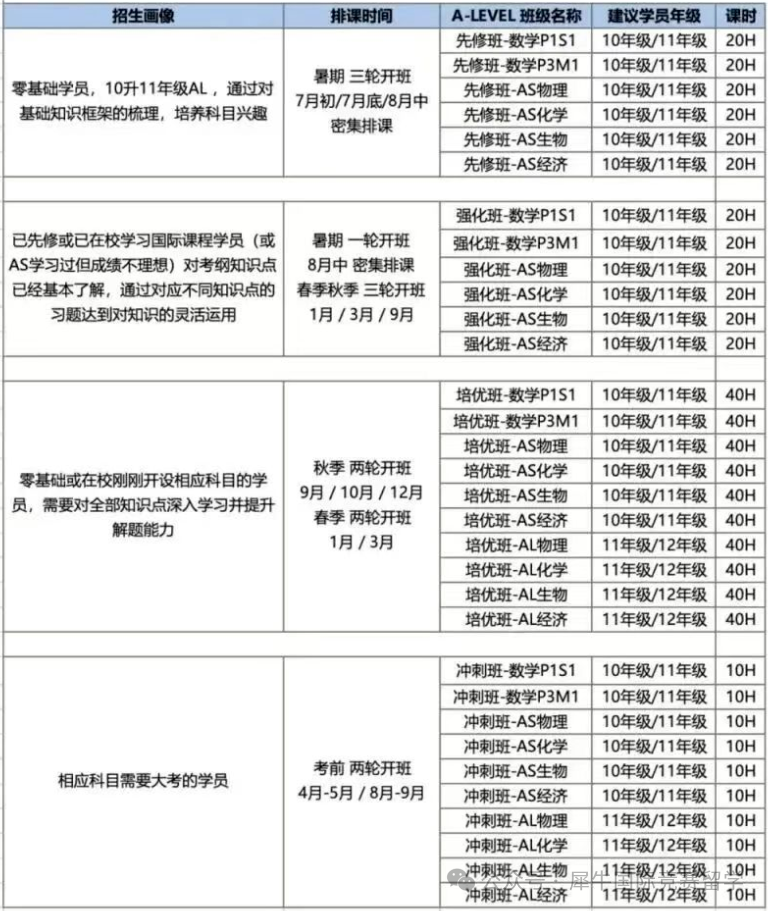 IG 到 A-Level 不是简单升级,而是学术能力的全面跃迁。暑假衔接做得好,AS 开局就能领先,后续冲 A*、申名校都会更从容。犀牛专为A-level的学生开设全科辅导课程,并针对不同基础学生设立四大班型: