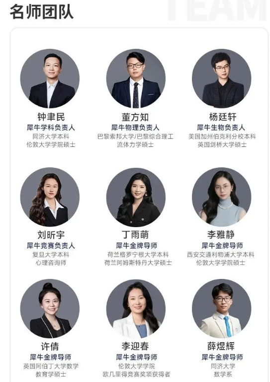 犀牛国际教育IGCSE课程的师资力量雄厚,国际教育领域经验丰富,由清华大学、芝加哥大学、剑桥大学、斯坦福大学、墨尔本大学等美国TOP30.英国G5的国内外一流大学的博士、硕士背景的老师组成。