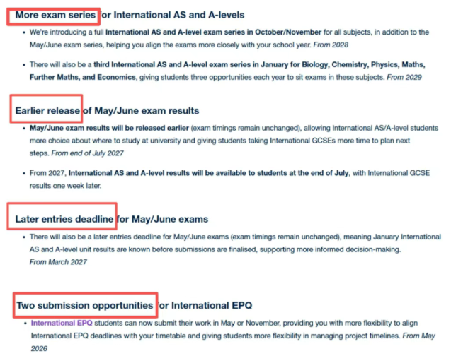 2028年起:在现有的5/6月考试系列之外,为所有International AS和A-level科目新增一个完整的10/11月考试系列,更好地匹配学校学年安排。