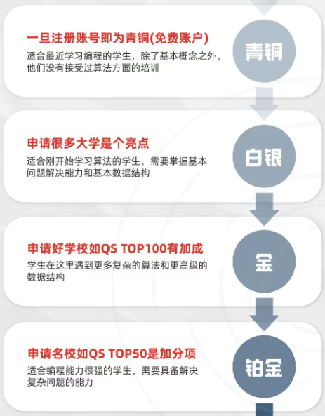 USACO竞赛采用“逐级晋升”模式,竞赛一共分为四个级别,分别是:铜(Bronze)、 银(Silver)、金(Gold)、铂金(或称白金)(Platinum),只要注册USACO 账号即为铜级。