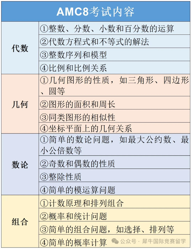 AMC8 整体难度与国内小学六年级至初中一年级数学水平相近,其知识点与国际课程七至八年级数学大纲重合度较高。